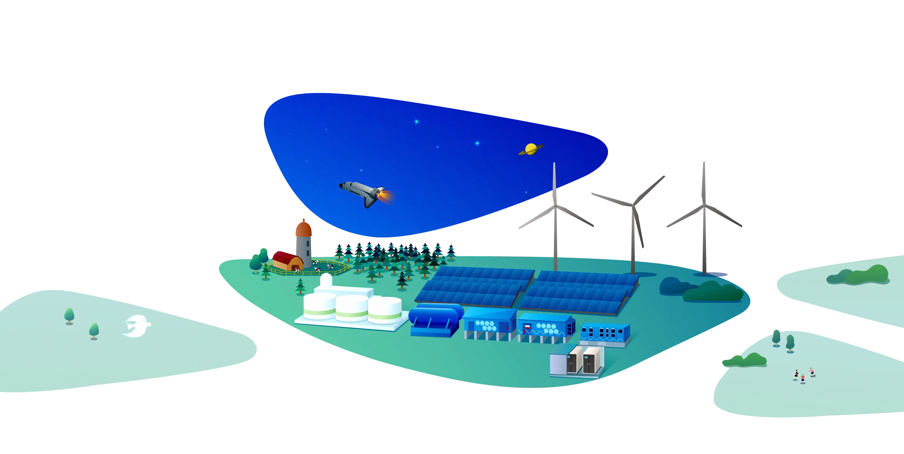 当社は「カーボンニュートラル事業開発部」を立ち上げました。高砂熱学が保有する環境技術に加え、自治体・企業や先端技術を持つ学会・スタートアップなどとの連携を図っています。製造から利用まで一貫してCO₂を排出しない「グリーン水素」をはじめ、サステナブルなエネルギーを社会に提供します。