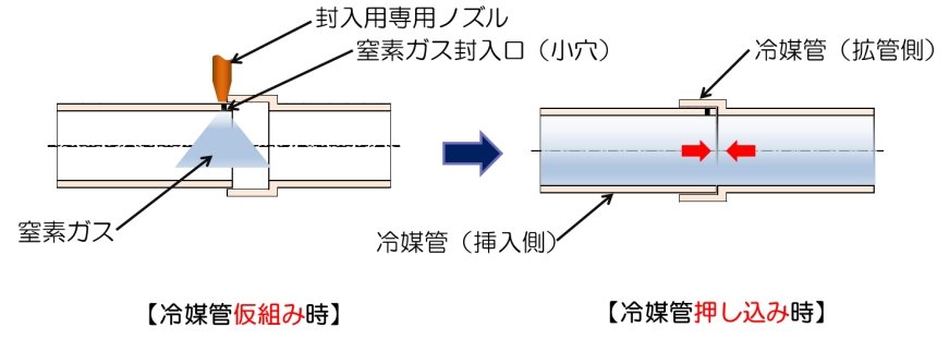 - 冷媒配管に窒素ガス封入用の開口を開け、所要量の窒素ガスを封入し、ろう付します。窒素ガスを配管内部に充満させることで、管内の空気を押し出し配管内部の酸素をなくし、酸化被膜の形成を抑制します。
