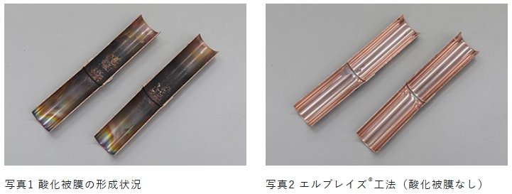 写真1は、酸化防止を行わない場合の酸化皮膜の形成状況です。写真2は、エルブレイズ®工法でのろう付け後の配管内面の状況で、酸化皮膜が形成されておりません。