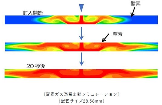 CFD(流体解析)を行い、窒素ガス封入時の酸素ガスが管内から押し出される状況を、視覚的に表しました。