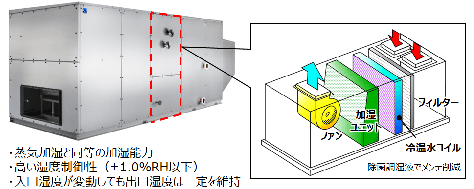 - 本製品*はダイナエアー㈱との共同開発品であり、液体調湿剤の濃度制御と温水コイルの温度制御によって、任意の露点温度を得る原理の加湿ユニットです。